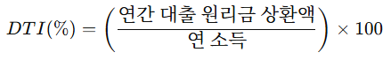 DTI(총부채상환비율, Debt to Income Ratio)는 대출자의 소득 대비 전체 대출 원리금 상환액이 차지하는 비율을 의미합니다. 즉, 개인이 벌어들이는 소득 중에서 대출 상환에 사용되는 금액이 얼마나 되는지를 나타내는 지표입니다.