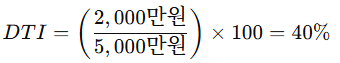 예: A씨의 연 소득이 5,000만 원이고, 대출 원리금 상환액이 연 2,000만 원이라면, DTI는 다음과 같습니다.