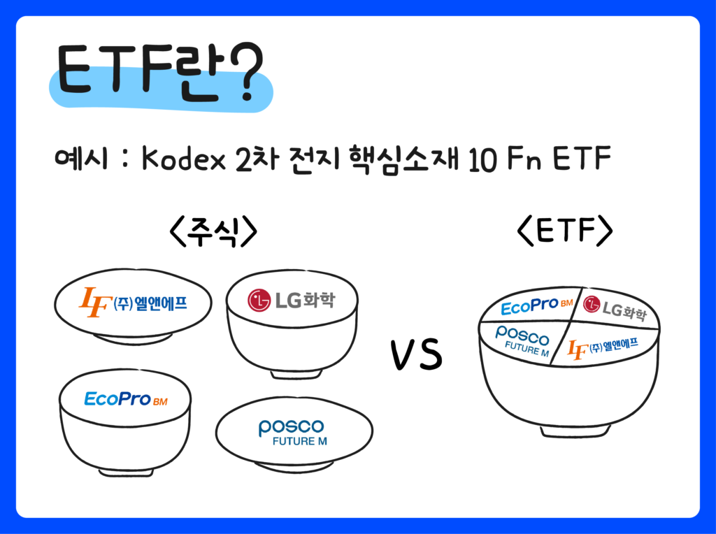-> 즉, ETF는 저렴한 비용으로 다양한 자산에 분산 투자할 수 있는 효율적인 투자 수단!