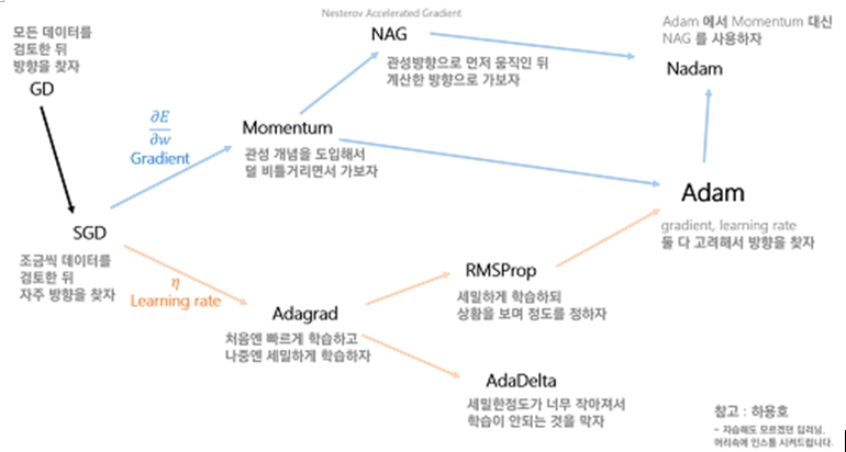 Adagrad ★: 각 매개변수의 경사를 재조정하여 사실상 각 매개변수에 독립적인 학습률을 부여하는 정교한 경사하강법 알고리즘입니다. 학습률 (learning rate)이 작으면 학습 시간이 길어지고, 반대로 크면 발산해서 학습이 제대로 이루어지질 않는데 이러한 문제를 학습률 감소 (learning rate decay)를 통해 해결합니다.