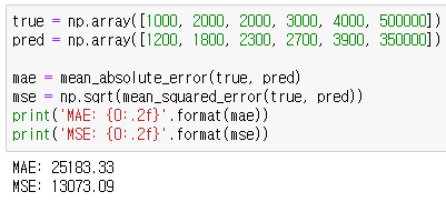 - 여기서 갑자기 실제 값: 500,000 예측 값: 350,000인 데이터가 들어왔습니다. 그때 MAE와 MSE는 다음과 같이 25183.33, 13073.09가 됩니다.