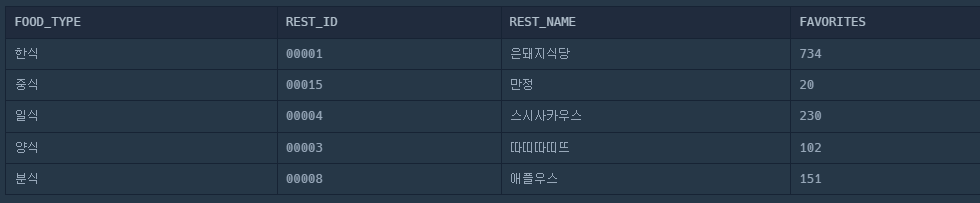 (SELECT FOOD_TYPE, REST_ID, REST_NAME, FAVORITES,