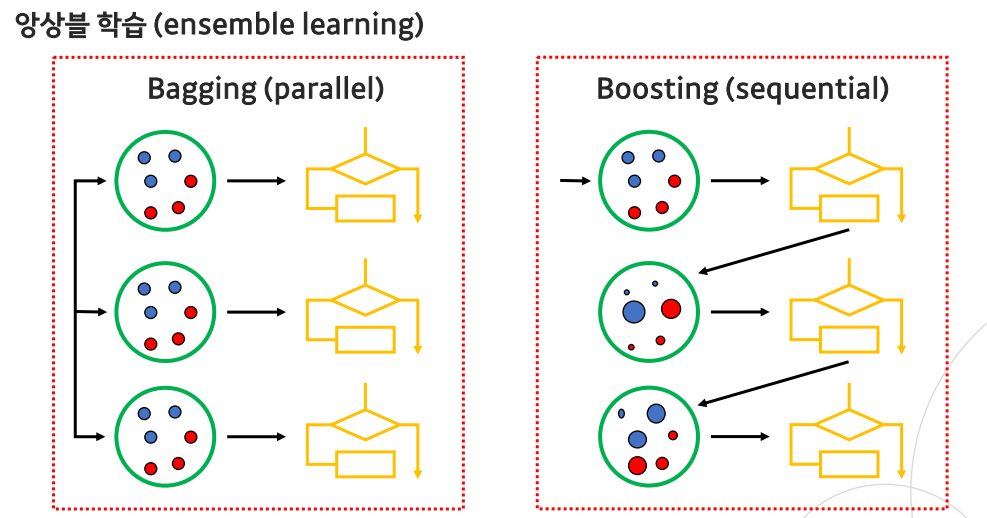 - 배깅: 병렬 처리 방식으로 여러 개의 독립적인 모델을 사용