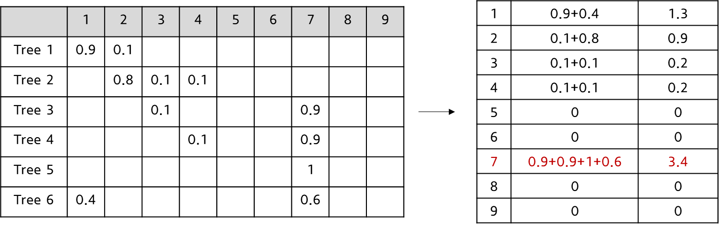 예: 손글씨 숫자를 1~9로 분류하는 decision tree 6개를 학습 후, 숫자 7을 보여줬을 때 tree 1~2는 각 1, 2를 찍고 tree 3~6은 다 7을 찍었으면 7로 예측