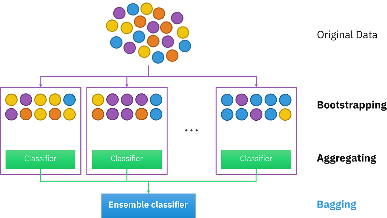 - 한 가지 분류 모델을 여러 개 만들어 서로 다른 학습 데이터로 학습 시킨 후 (Bootstrap), 동일한 테스트 데이터에 대한 서로 다른 예측값들을 투표를 통해 (Aggregating) 가장 높은 예측값으로 최종 결론을 내리는 방법